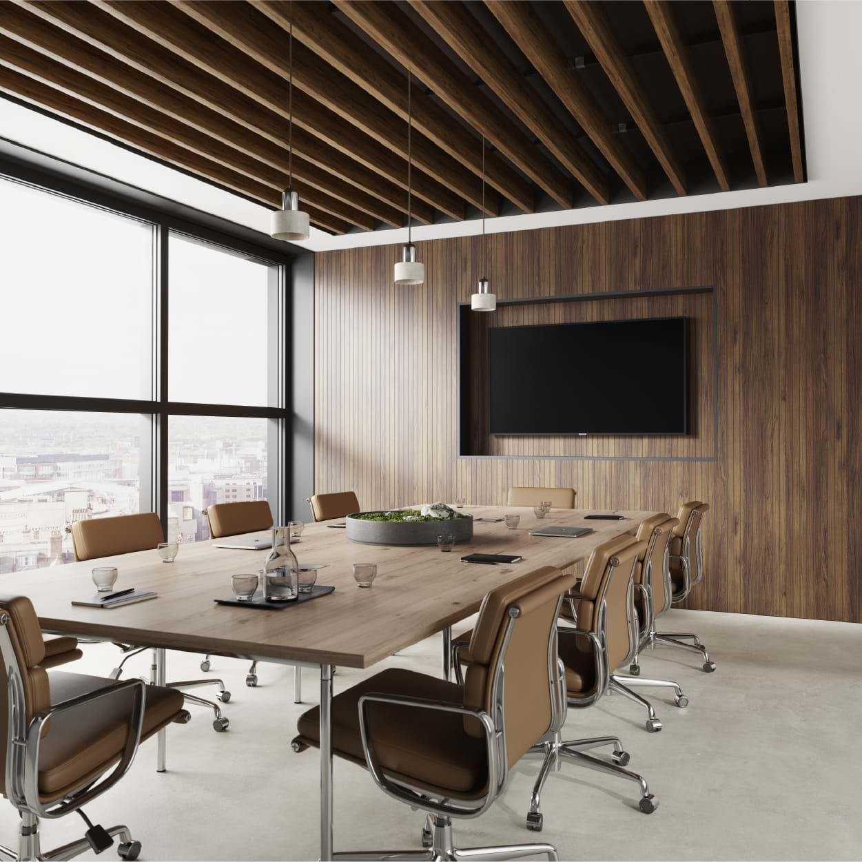 The contrast between the dark tones and the brown of our wood wall panel adds richness and intensity to the room, making it a striking focal point. This combination is ideal for those who want to create a sense of opulence and glamour.